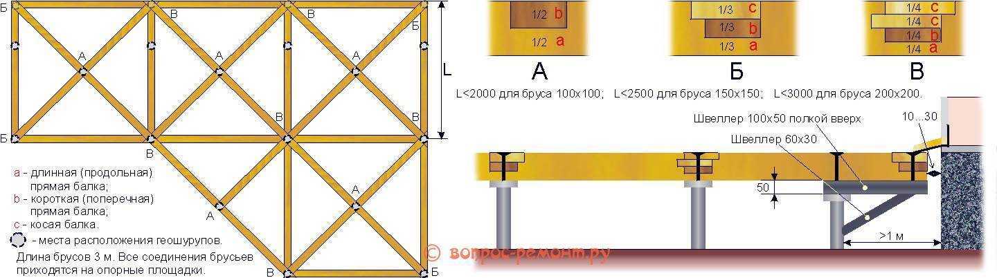 Строя ее, придется аккуратно поплотничать, т.к. кроме прямых врезок вполдерева нужно будет делать косые по третям и четвертям (вверху справа на рис.). Зато всю опору можно будет поставить на геошурупы и настелить декингом, а свес края дать до половины стороны модульной ячейки. Собирается геодезический каркас по определенным правилам: