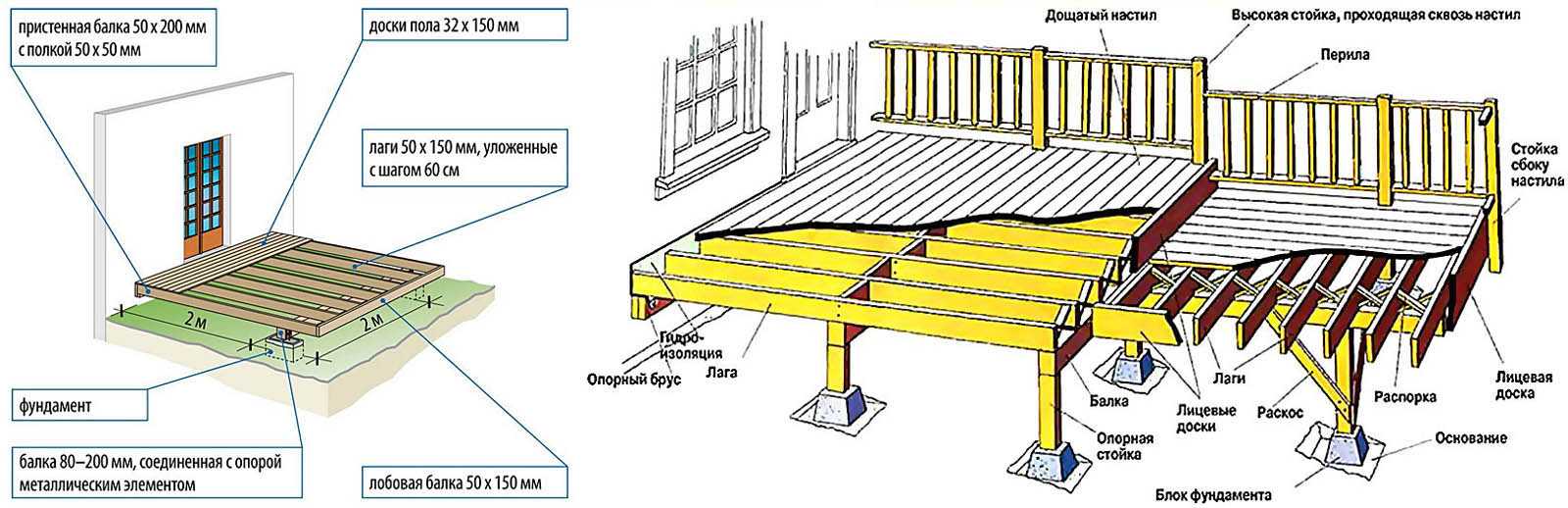 Конструкции обзорных террас для ровного места и небольшого уклона показаны на рис. Размеры той, что слева, 2х2 м – предельные для данной силовой схемы. Увеличить размеры модуля террасы в плане до 3х3 и даже до 3,5х3,5 м можно, подкрепив лаги из досок 150х45 Х-образными распорками (справа на рис.).