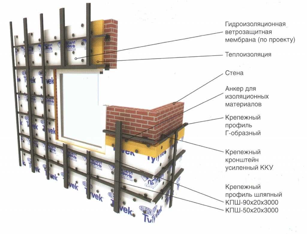 - каркас с крепежными изделиями (подсистема для вентилируемого фасада);