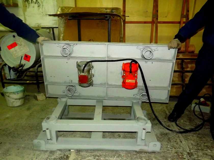 Для обустройства пресса на вибрационном столе закрепляют дополнительную панель в виде плоской крышки, на неё оказывается большое давление. Используются отдельные элементы, которые по размерам чуть меньше форм и входят в них, чтобы прессовать раствор.