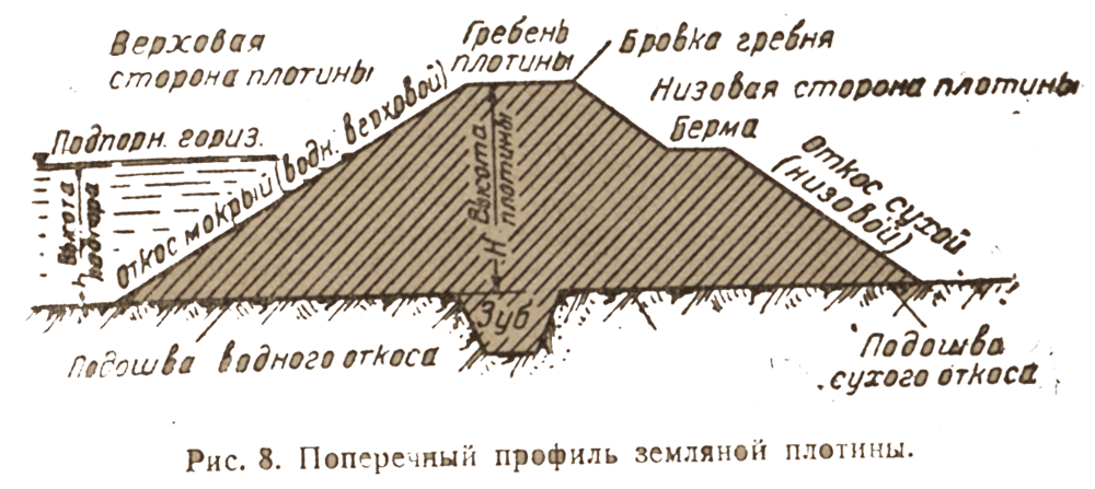 Для того чтобы поднять уровень воды на реках и иных водостоках, устраиваются плотины. Плотины могут устраиваться из различных материалов, в частности из земли. На рис. 8, снизу, дан поперечный разрез по земляной плотине. На нем показаны все основные части плотины.