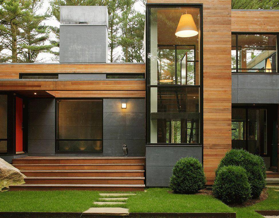 Грузные части дома можно разбавить ажурными элементами в виде кованых перил и иных металлических элементов, дополнить их можно отделкой из натурального камня, которая идеально сочетается с металлическими конструкциями.