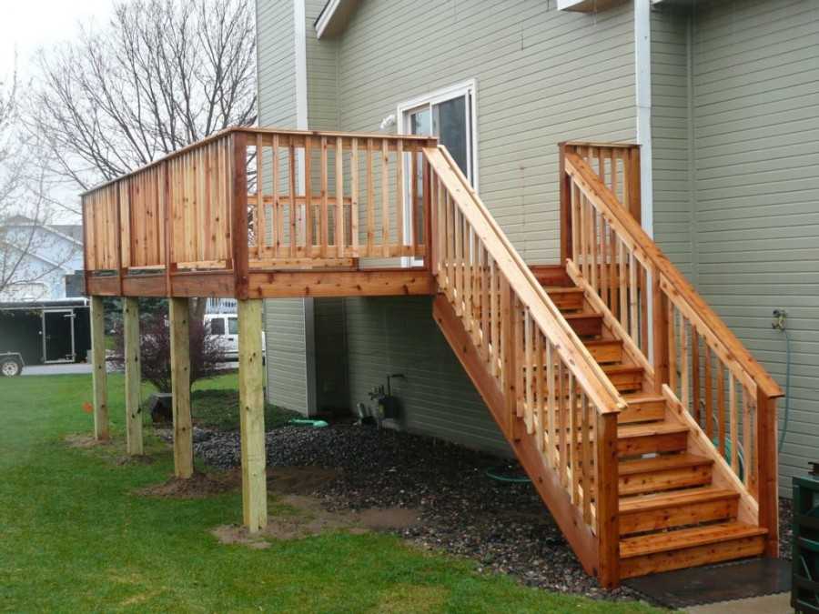 Деревянная лестница на крыльцо имеет лишь один существенный недостаток — короткий срок службы. Дело в том, что доски и брусья, не особенно хорошо переносят повышенную влажность и перепады температур.