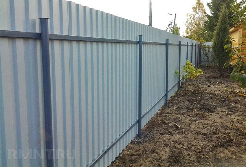 Прогоны между опорами обычно делают 1,5 или 2 метра. К стойкам приваривают хомуты из круглой стали с резьбовыми окончаниями. Концы хомутов продевают в отверстия листового материала (профнастила, шифера, поликарбоната). На резьбу навинчивают оцинкованные гайки, предварительно одевают на них резиновые и металлические шайбы. Существуют и другие способы крепления листов ограждения.