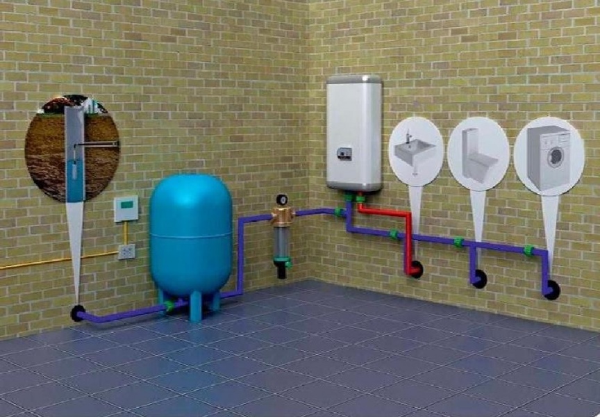 - внутри дома – установка сантехнического оборудования, подключение гидроаккумулятора;
