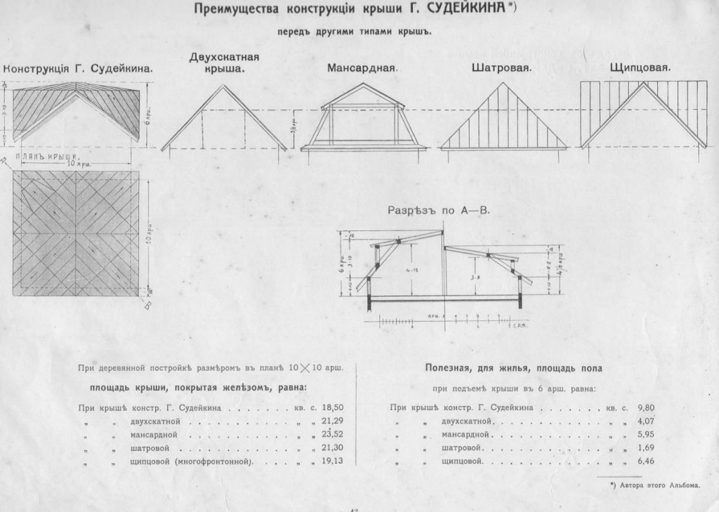 В далеком 1914 году архитектор Григорий Судейкин издал свою собственную книгу под названием «Альбом проектов зимних дач, особняков и изб». В ней можно отыскать самостоятельно созданные архитектором расчеты разных крыш для разных домов.
