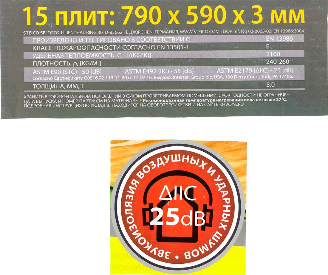 Помимо гигиенических, пожарных, сертификата качества и соответствия на официальном сайте Isoplaat (Изоплат) представлены протоколы испытаний по звукоизоляции на английском языке. Как известно, измерения по шумоизоляции проводят на предмет поглощения удара: она достигает более 20 дБ за тонкую подкладку и около 30 дБ за пластину 7 мм толщины.