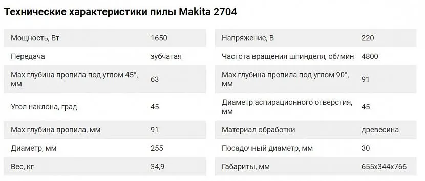 Технические характеристики модели Makita 2704 Источник vseinstrumenti.ru