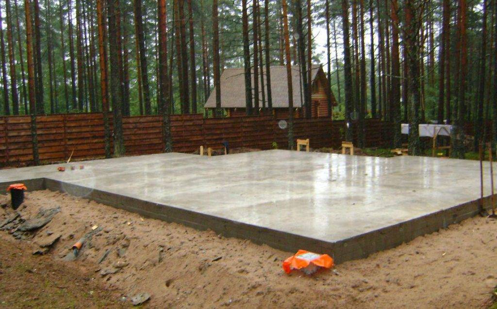 Этапы работы схожи с установкой ленточного фундамента, но бетон заливают на всю опорную площадь строения: