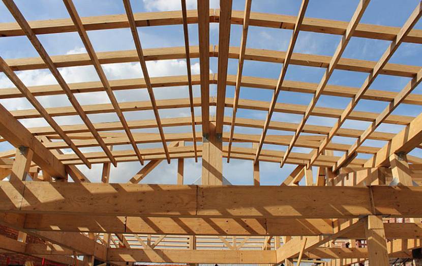 Вертикальные брусья являются главными несущими конструкциями. Внизу они прикрепляются к горизонтальным балкам, вверху соединяются такими же балками, создавая основание для второго этажа.