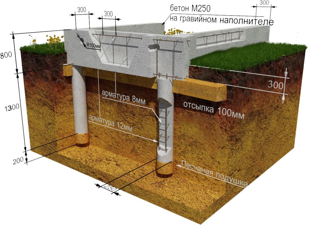 Эта конструкция состоит из опорных столбов, расположенных в 2-3м между собой. Существуют сборные и монолитные варианты.