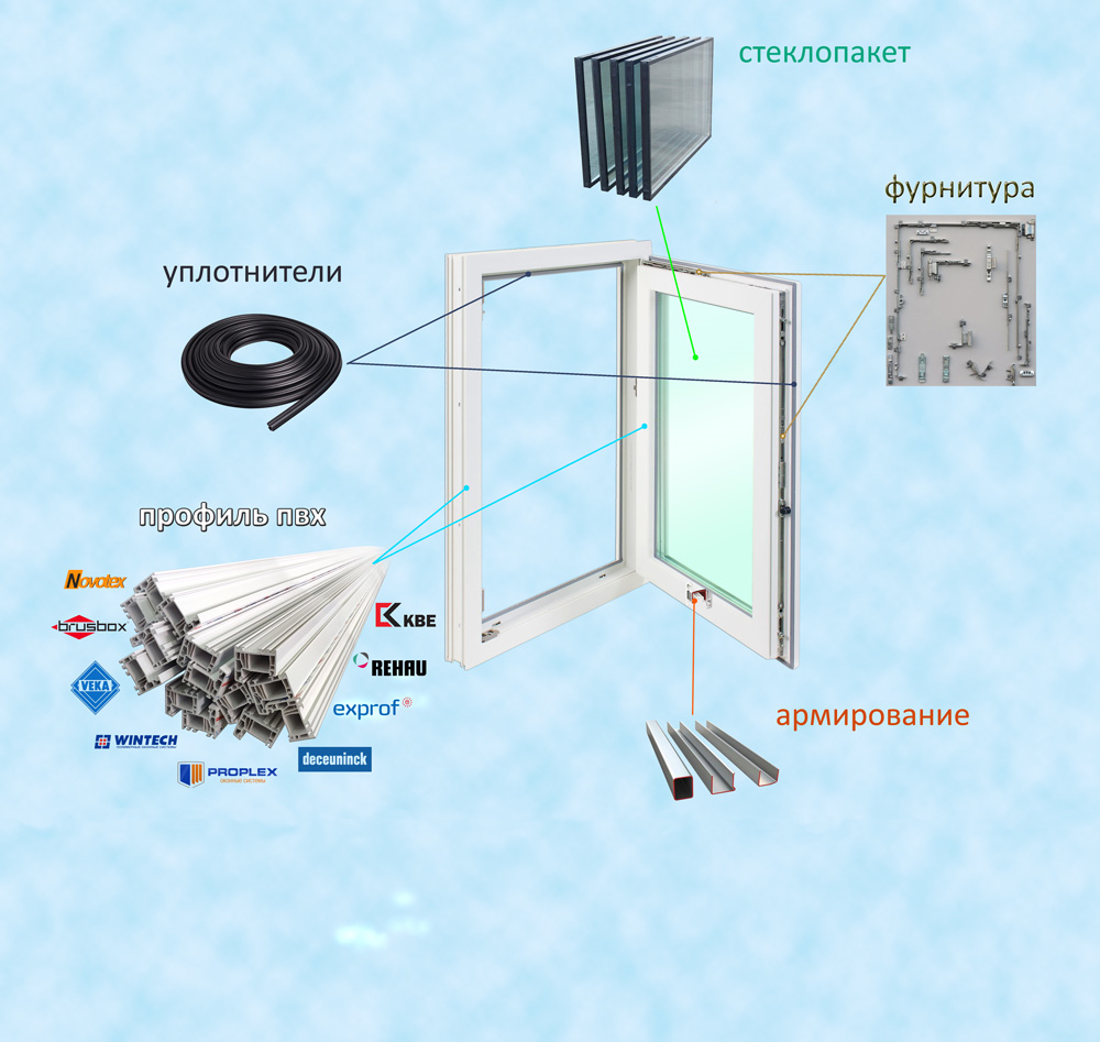 Несмотря на разнообразие брендов, каждый из которых описывает товар по-своему, система окна с профилем из ПВХ состоит из одинаковых компонентов. Внешне конструкция выглядит просто: пластиковый каркас, прозрачные окна, аккуратные ручки.