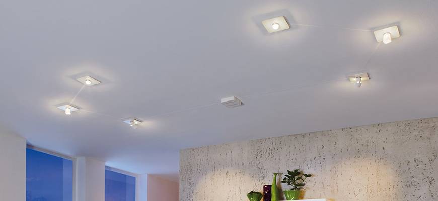 В тех случаях, когда в светильнике предусмотрены лампы накаливания, надо соблюдать одно правило: расстояние от них до пленки должно быть не менее 10 см, а сами лампочки — не мощнее 40 Вт. Поэтому если необходимо иметь более яркий свет, предпочтение лучше отдать люстрам с длинными подвесами.