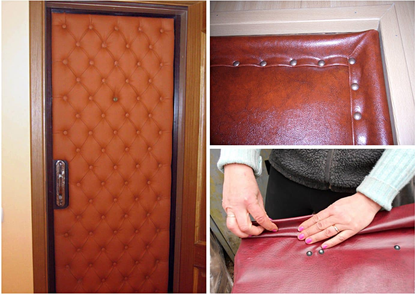 Внешнюю часть двери можно оббить дермонтином, кожей или винилом. Конечно, сам материал обивки имеет определенный шумоизоляционных эффект, однако он незначителен. Лучше использовать подкладку из шумоизоляционного материала, в таком случае можно будет добиться ожидаемого результата. Толщина утеплителя не нужна слишком толстая, вполне достаточно 3-5 миллиметра.