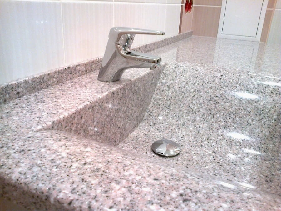 - Гранитные. Состоят из мелкой каменной крошки и полимерных смол, являются гладкими и очень устойчивыми к механическим воздействиям.