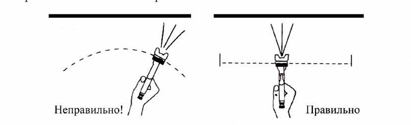 Чтобы не допустить перераспыл, соблюдайте расстояние между факелом и обрабатываемой поверхностью в диапазоне 15-25 см. Распылять состав нужно равномерно, передвигая краскопульт перпендикулярно поверхности, как это показано на изображении.