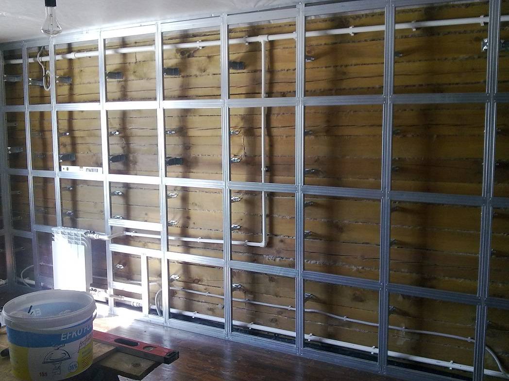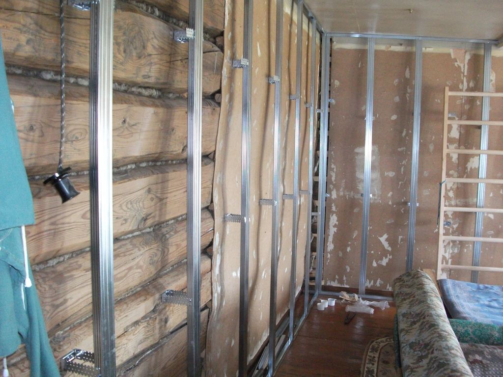- На каркас из стандартных оцинкованных профилей, которые являются неотъемлемой частью гипсокартонных систем. Этот вариант отличается тем, что можно получить достаточно ровную поверхность без каких-либо усилий. Набор профилей, а также крепежа к ним, позволяет решить любую проблему, выровняв стены любой кривизны. Как правило, применение гипсокартонных систем позволяет получить между зашиваемой поверхностью и гипсокартоном промежутка. В этом промежутке размещаются различные коммуникации и электрическая проводка. Кроме этого, в подобный промежуток укладывается утеплитель, а также звукоизоляция. Если не заполнить этот промежуток, то гипсокартон прекрасно проводит звуки. Как правило, стараются решить сразу несколько проблем, в том числе и проблемы со звукоизоляцией за счет применяемого материала.