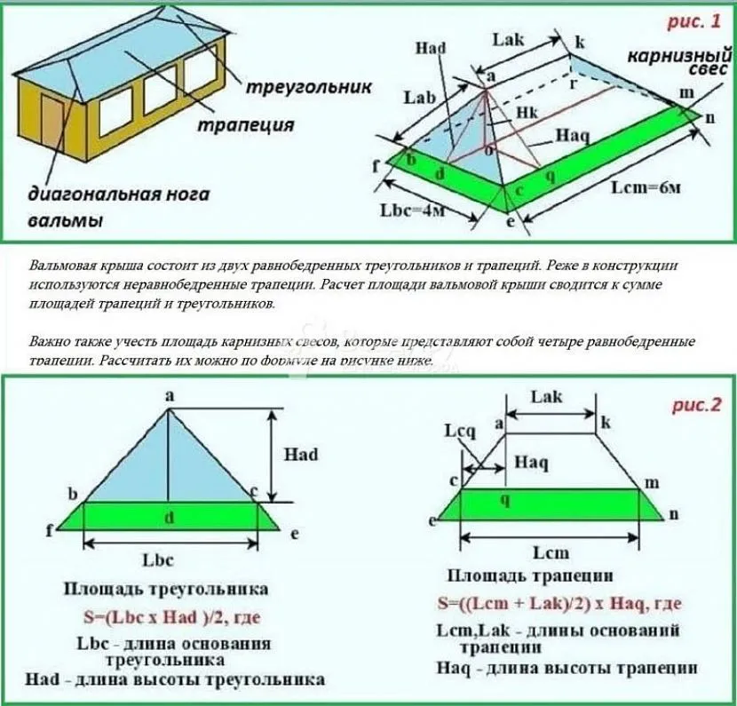 Чтобы высчитать своими руками, сколько потребуется кровельного покрытия для вальмовой крыши, необходимо вспомнить школьную программу по геометрии. Дело в том, что форма скатов представляет два треугольника и две трапеции.