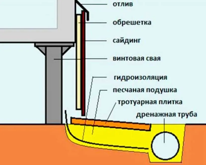 - Планировка прилегающей территории под уклоном к дому, что способствует стеканию воды к стенам постройки.