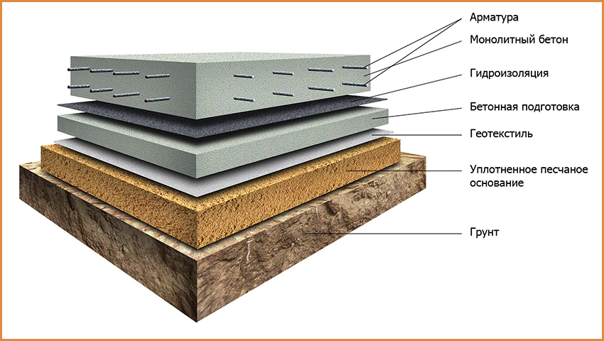 Для строительства понадобится раствор бетона и армирующая сетка. Минус такого типа основания состоит в том, что оно может быть низковато для жилого строения.