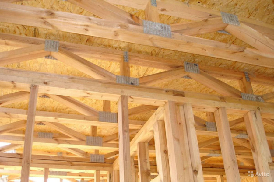 Фронтонные свесы укреплены блоками и способны выдержать снеговую нагрузку. На фото видно, что стропила находятся в одной вертикальной проекции со стойками внешних стен. Это позволяет правильно передавать нагрузку с кровли на фундамент.